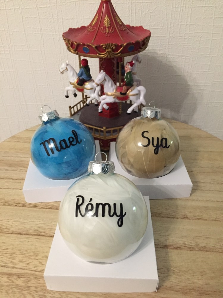 Ne tardez plus et commander votre boule de Noël avec le prénom de votre choix, plumes, billes, 1er Noël, le choix est large alors décidez vous et cliquez juste ici pour me contacter